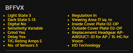 | AP-BFFVX-1500 | AirPlus Vision Black Auto-Darkening Helmet with BFFVX Lens |
