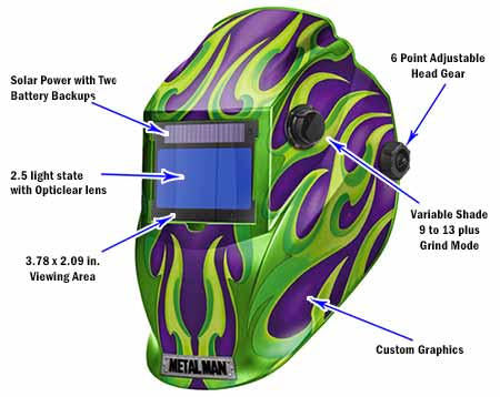 Metal Man APG8735SGC Purple w/ Green Flames BIG Window Variable Shade Auto Darkening Welding Helmet