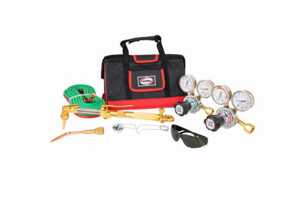 - Accessories include Shade 5 safety glasses (ANSI Z87.1 CE Weld), Handheld ignitor, 3/16 in. x 20 ft. twin B & B R-grade hose and Harris black and red insulated tool kit bag