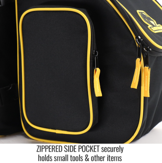 - Zippered outside pocket securely holds small tools & other items