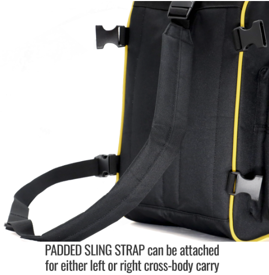 - Includes adjustable sling strap for cross-body or over-the-shoulder carry