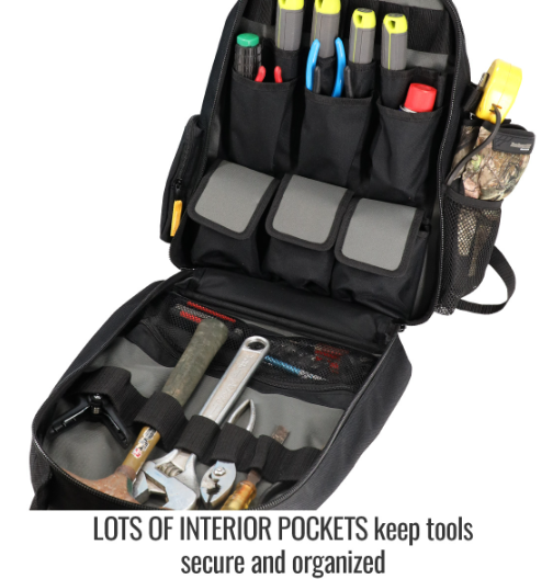 • Large zippered compartment with multiple pockets, webbing, & tool holders