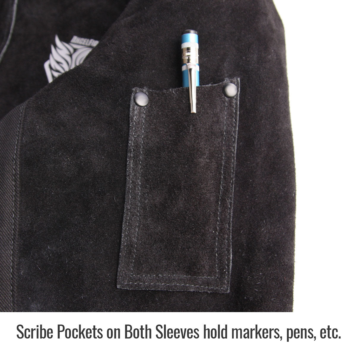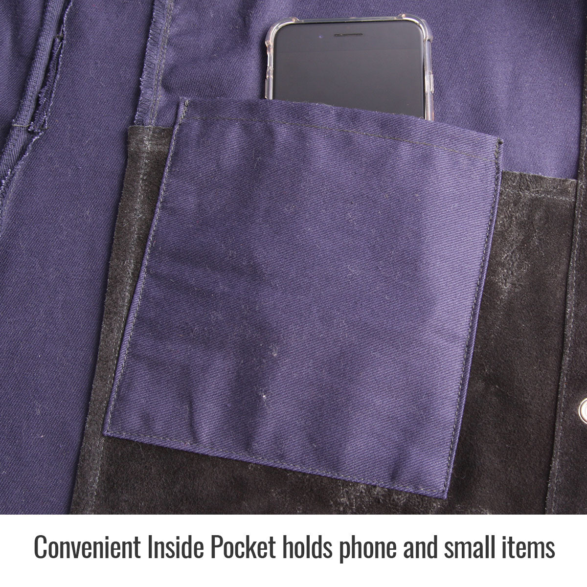 - Durable black split cowhide sleeves, shoulders, chest, torso