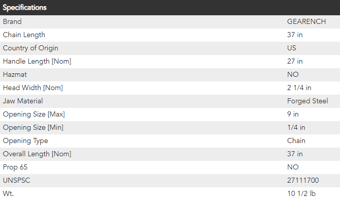 Gearench C12-44-P Titan Chain Tong Tool, 1/4" - 9" Opening, 37" Long (1 EA)