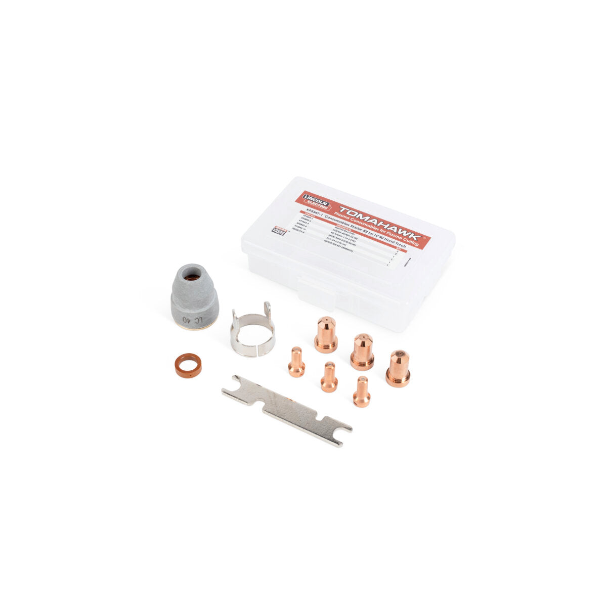Plasma Consumable Kit for your Lincoln Electric LC40 handheld torch (K2847-1) and compatible with Lincoln Electric Tomahawk 45 plasma cutters (K5458-1). Kit includes Genuine Lincoln Parts: 3 electrodes, 3 40/45A nozzles, 1 retaining cap, 1 swirl ring, 1 drag spacer, and 1 electrode key (wrench) stored in 1 durable plastic storage box with latch.