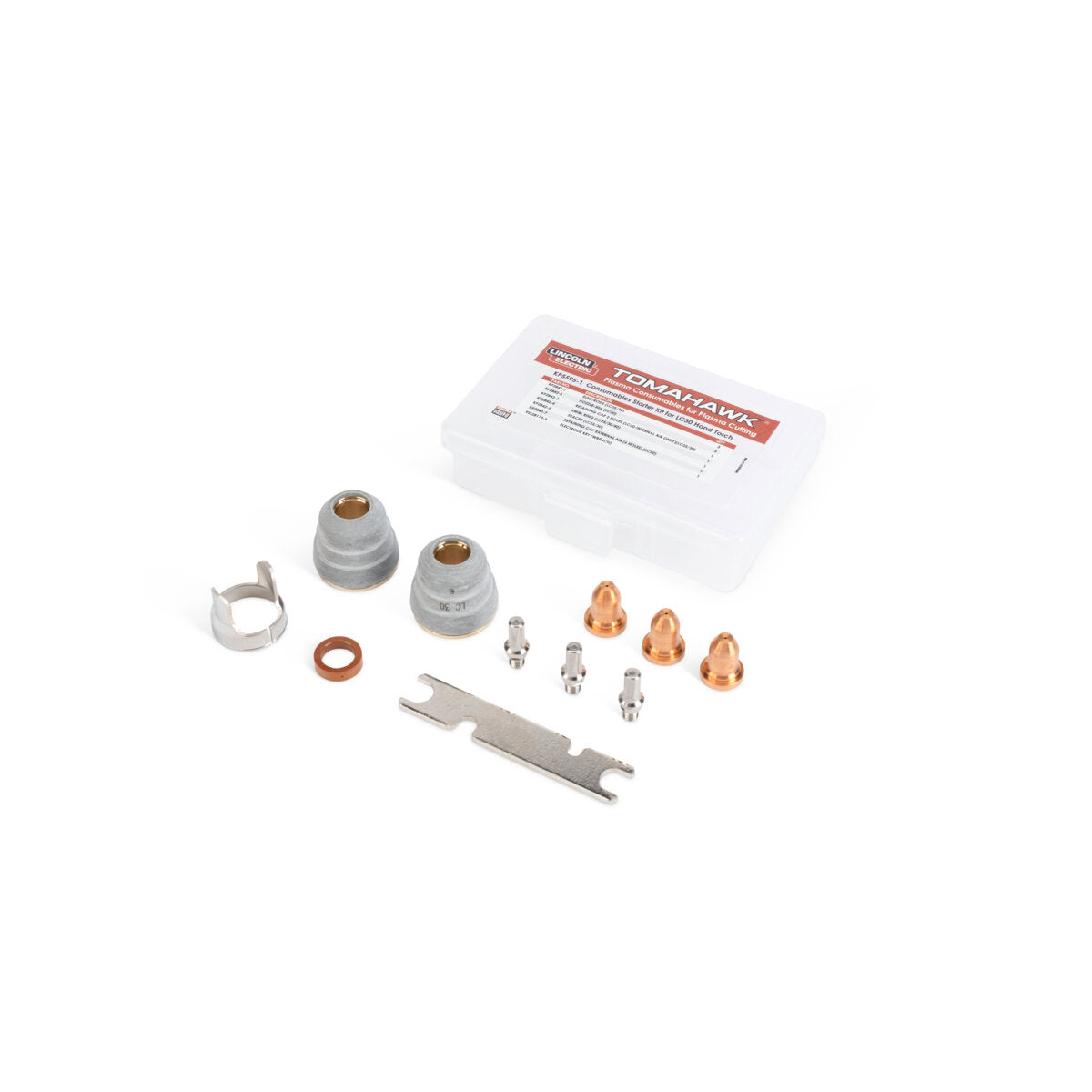 Plasma Consumable Kit for your Lincoln Electric LC30 handheld torch (K5537-1) and compatible with Lincoln Electric Tomahawk 30 AIR plasma cutters (K5457-1). Kit comes with Genuine Lincoln Parts: 3 electrodes, 3 30A nozzles, 1 retaining cap (internal air only), 1 swirl ring, 1 drag spacer, 1 retaining cap (external air only), and 1 electrode key (wrench) stored in 1 durable plastic storage box with latch.