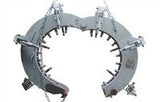 This Mathey Dearman Mega Rim Clamp aligns and reforms high tensile strength X65, X70 and X80 pipes with wall thicknesses up to 7/8" (22mm) (see chart below for tensile strengths). The clamp reforms pipe out-of-round condition up to 2" (51mm), gaining its strength from heavy-duty oval shaped side plates, latching mechanism, and flip-up jackbars for mating pipes.