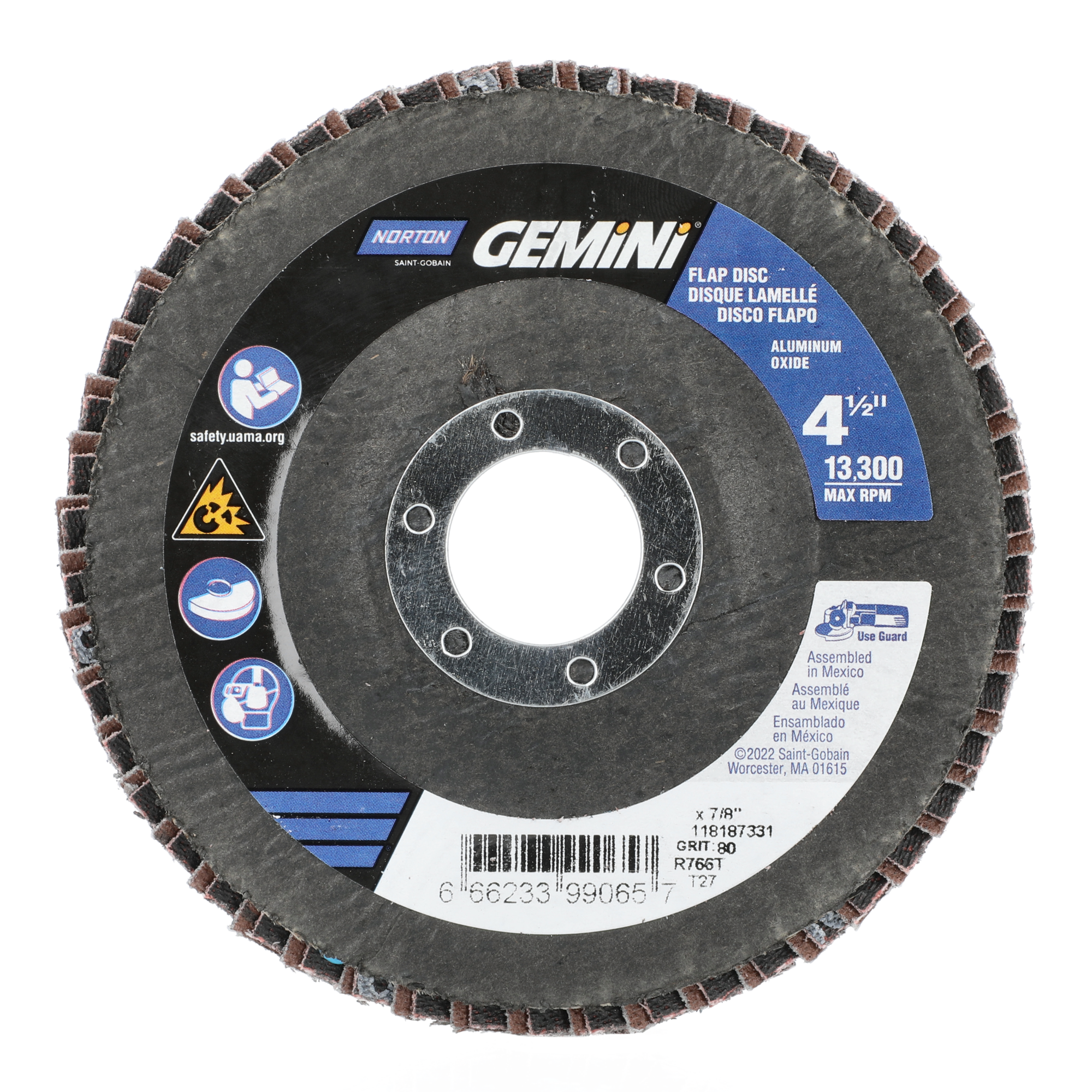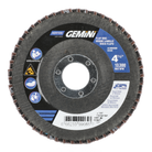 Blend and smooth your metal projects on flat surfaces at 0 to 15-degree angles using the Gemini R766 coarse grit center mount plastic flat flap disc. The Type 27 flat flap disc has an alternating zirconia alumina and aluminum oxide grain to give you maximum performance at a cost-effective price. The flexible plastic backing sets industry standards for trimmability and conforms to the metal surface during use. Great to blend, deburr and remove stock from soft metals, 300 and 400 series stainless steels, cast iron, titanium and super alloys.