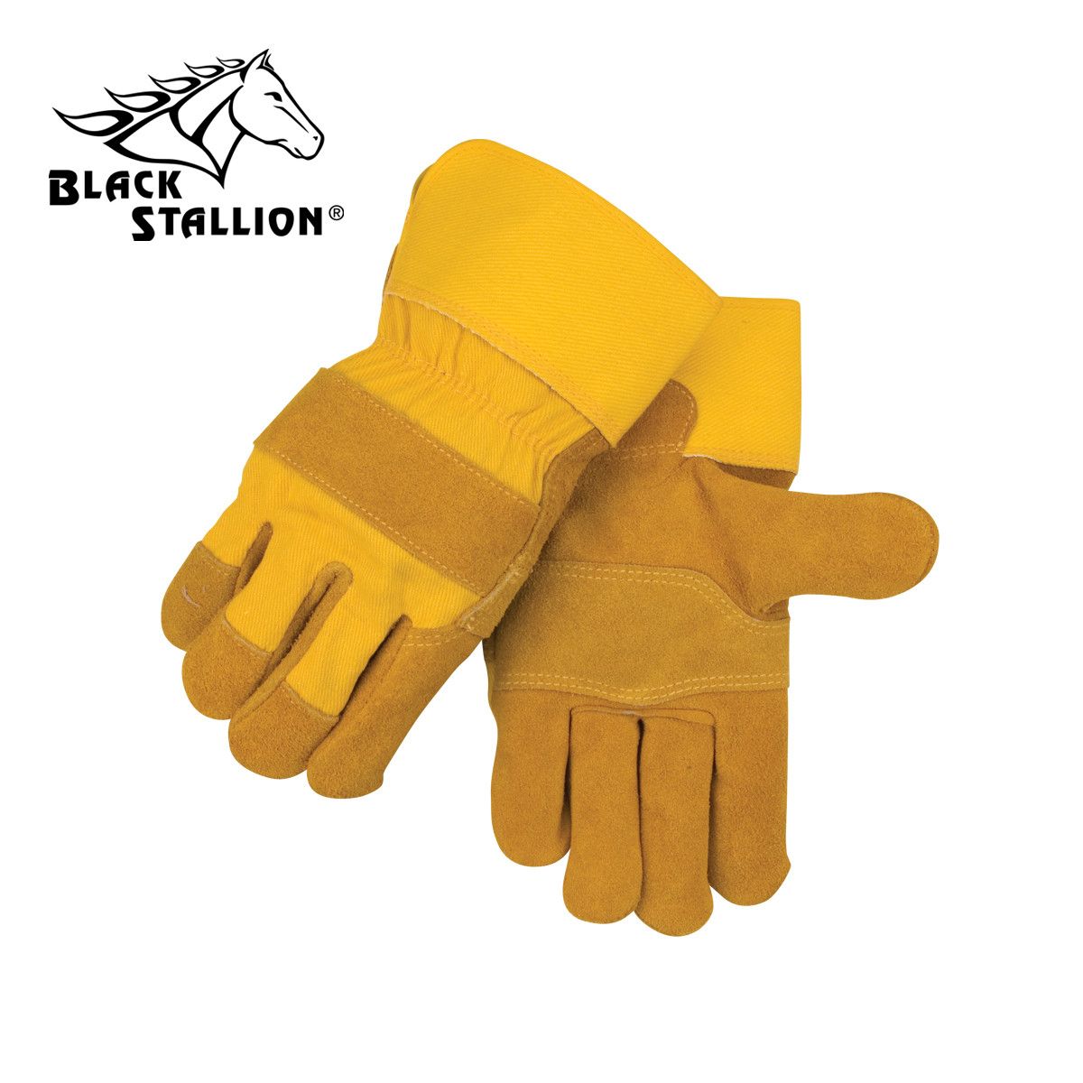 Side split cowhide leather includes patched palm for added durability and palm protection. Leather knuckle strip. Rubberized short cuff.