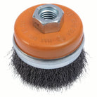 Crimped for light surface cleaning, rust and paint removal, etc. Safety supporting ring controls flaring to extend brush life. Once wires are worn down to the ring, the ring can be removed to expose more wire for extra brush life.
