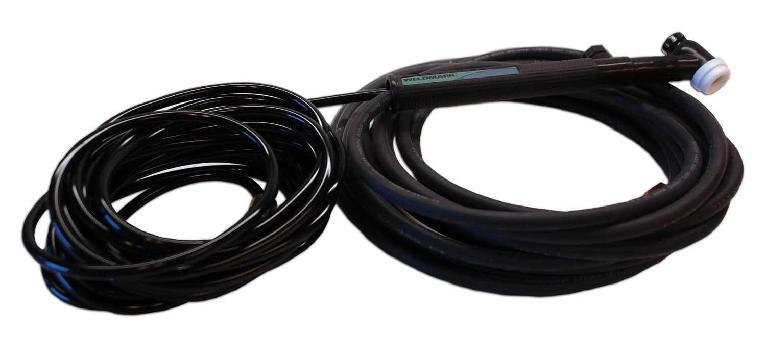 This is a 25 foot, flexible head w/ valve, 150 Amp, 2 piece Tig Torch made by Weldmark. It does not come with an TIG consumables.
