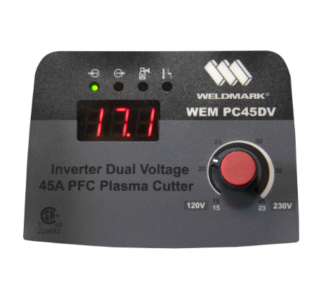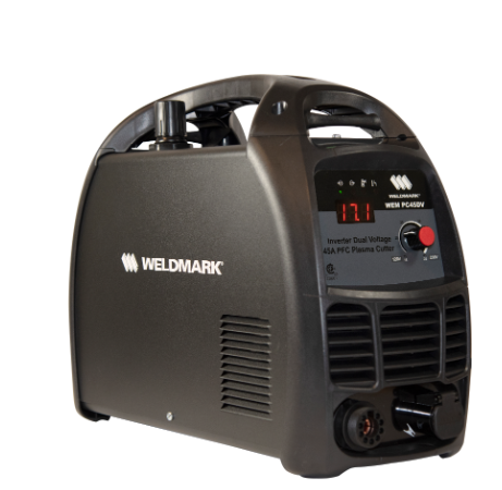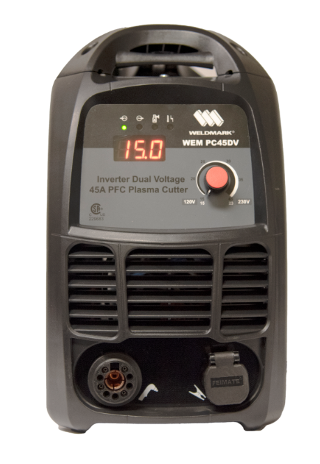 The Weldmark® PC 45DV Plasma Cutter is a dual voltage single phase DC inverter plasma cutter. It has output ranges of 15-23 amps at 120V, and 15-45 amps at 230V. Includes machine with plasma torch and cable assembly, 6 ft power cord, ground cable and clamp, 120v power adapter and extra nozzles and electrodes. Operation requires use of compresses air. Rated for standard duty.